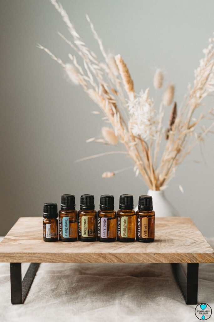 Guaiacwood essential oil bottle on a delicate textured background, styled in a flat lay.